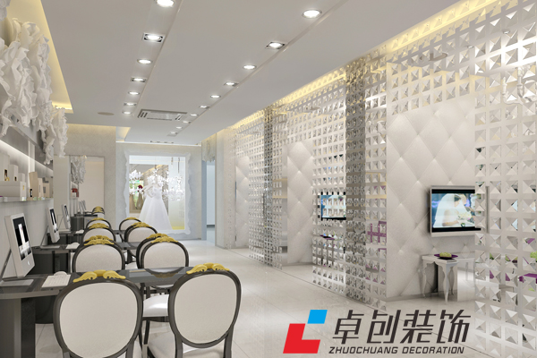 中小型影樓裝修利用鏡面成像的原理,可成倍地增加長(zhǎng)度、寬度和深度。在影樓店面裝修中若將一面墻裝上鏡子,那么就會(huì)使人感到房間擴(kuò)大了一倍。如果將鏡面安在天花板與墻壁的交接處,可以模糊界線,從而擴(kuò)展空間。影樓燈光照明設(shè)計(jì)通常與店面的色彩搭配。